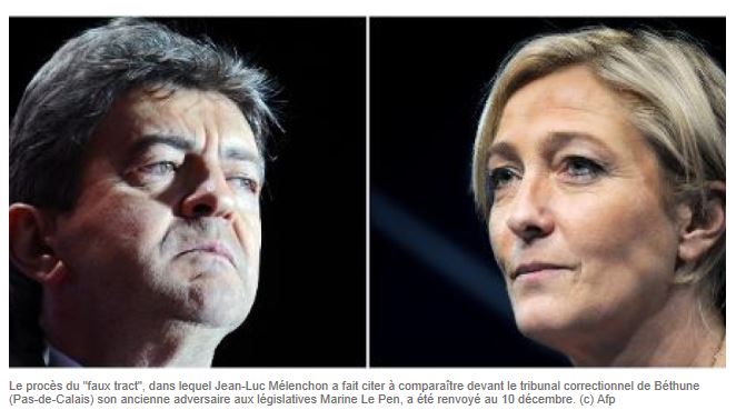 Cela fait beaucoup. Cependant il y a un risque que ces "droits" spéciaux lui soient attribués. En effet, Marine Le Pen a une chance pour elle, c'est que dans cette affaire précise son adversaire est Jean-Luc Mélenchon. Jean-Luc Mélenchon est tellement détesté par l'oligarchie que celle-ci renonce à défendre des principes pourtant basiques lorsque cela implique de le défendre, lui. Je le disais dans un post précédent, j'ai été désagréablement surprise du peu de retentissement que le passage de Marine Le Pen devant un Tribunal Correctionnel suscite dans la presse nationale. Et lorsque l'affaire est suivie, c'est sous l'angle du "match" entre Jean-Luc Mélenchon et Le Pen, jamais sous l'angle du combat entre les principes démocratiques et le Front National. Hier, l'AFP a doublé sa dépêche d'un photo-montage où l'on voyait les deux protagonistes. Alors que Marine Le Pen est présentée sous des atours normaux, Jean-Luc Mélenchon a l'air tellement dangeureux qu'il fait objectivement peur à voir!